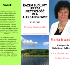 Szanowni Państwo, W najbliższych wyborach samorządowych wyznaczonych na 21 X 2018 r. zamierzam ubiegać się o mandat radnego Rady Gminy Zabierzów na kolejną kadencję: 2018–2022 w Okręgu nr 1: Aleksandrowice, Balice, Brzoskwinia, Rząska, Szczyglice. Ordynacja wyborcza w Gminie Zabierzów (jako tej która liczy powyżej 20.000 mieszkańców) jest bardzo niekorzystna dla małych […]